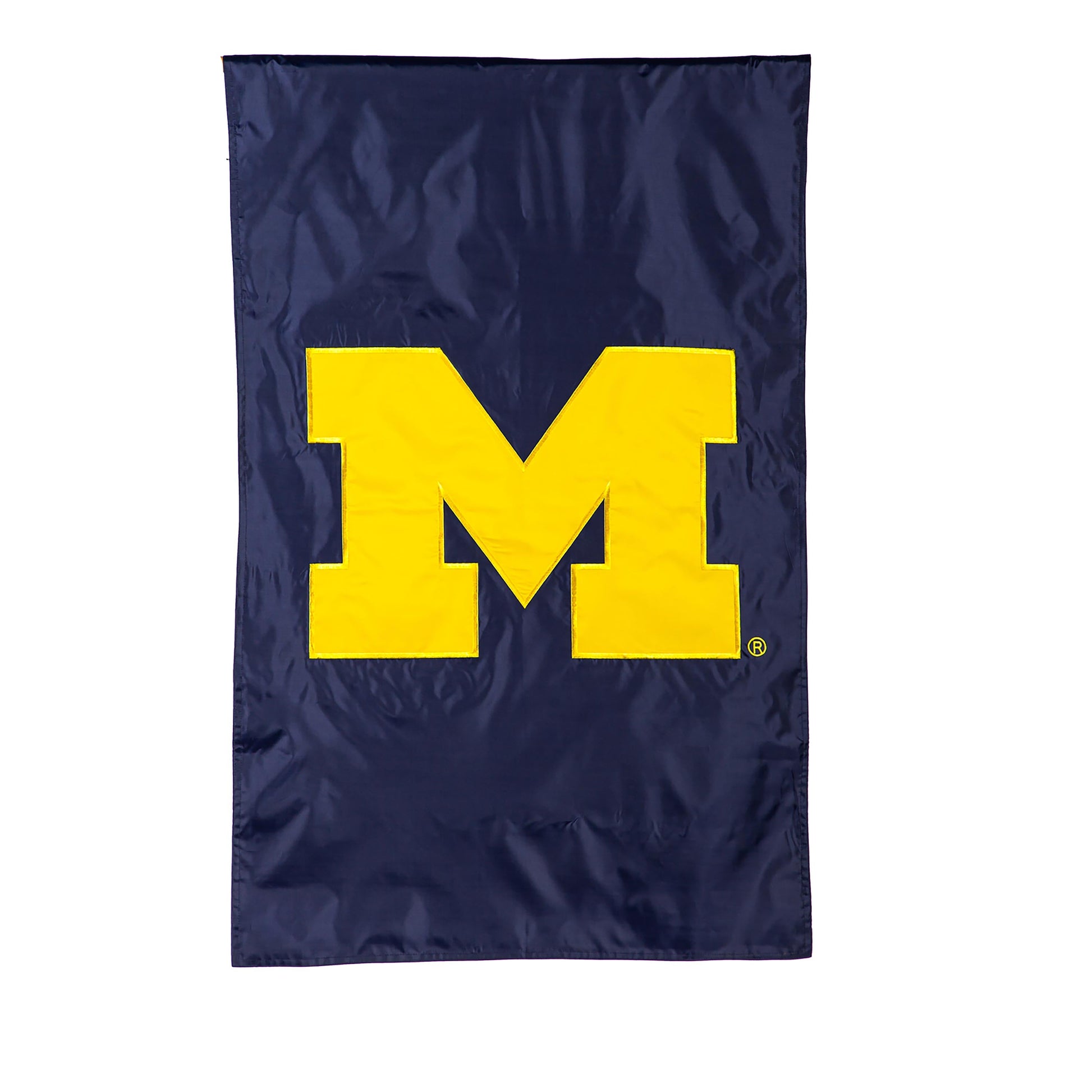 Get ready for gameday with this Michigan Applique House Flag that's perfect for showcasing team pride any time of year. Featuring officially-licensed team colors and logo, this flag is ideal for any fan. Each Evergreen Flag applique flag is carefully crafted from multiple layers of 310 denier nylon that can withstand a variety of weather conditions. We combine pieces of fade-resistant, strong fabric with tight, detailed stitching to create a dimensional mosaic effect. The soft yet heavyweight material illuminates beautifully in sunlight. Each flag features a sleeve that fits standard flagpoles or stands, sold separately.
