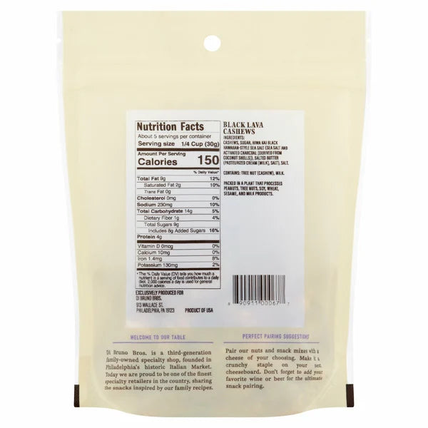 A Di Bruno Bros. classic and one of our most popular items! Hawaiian Black Lava Sea Salt Cashews are packed with sweet and savory flavors and a crunchy, nutty texture.