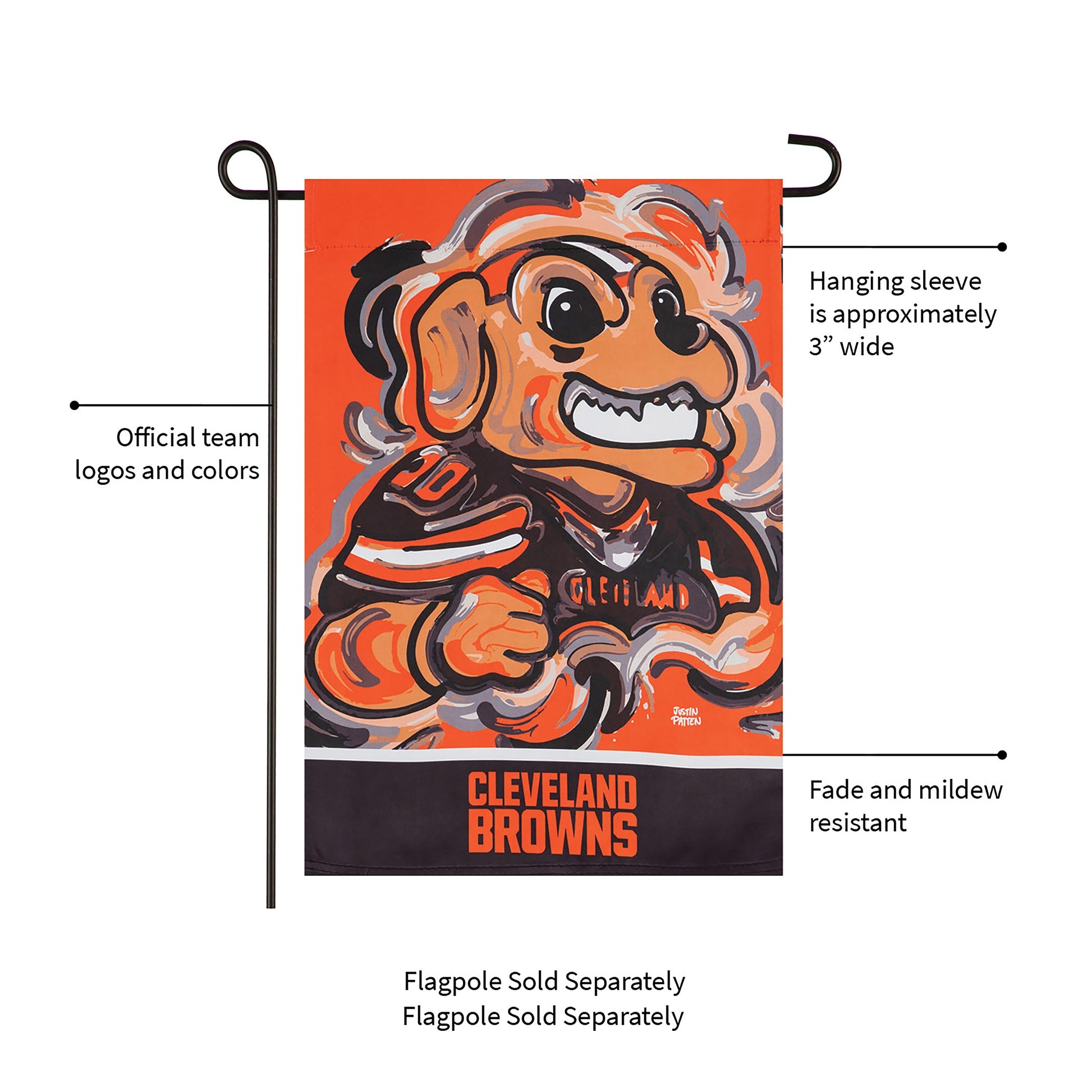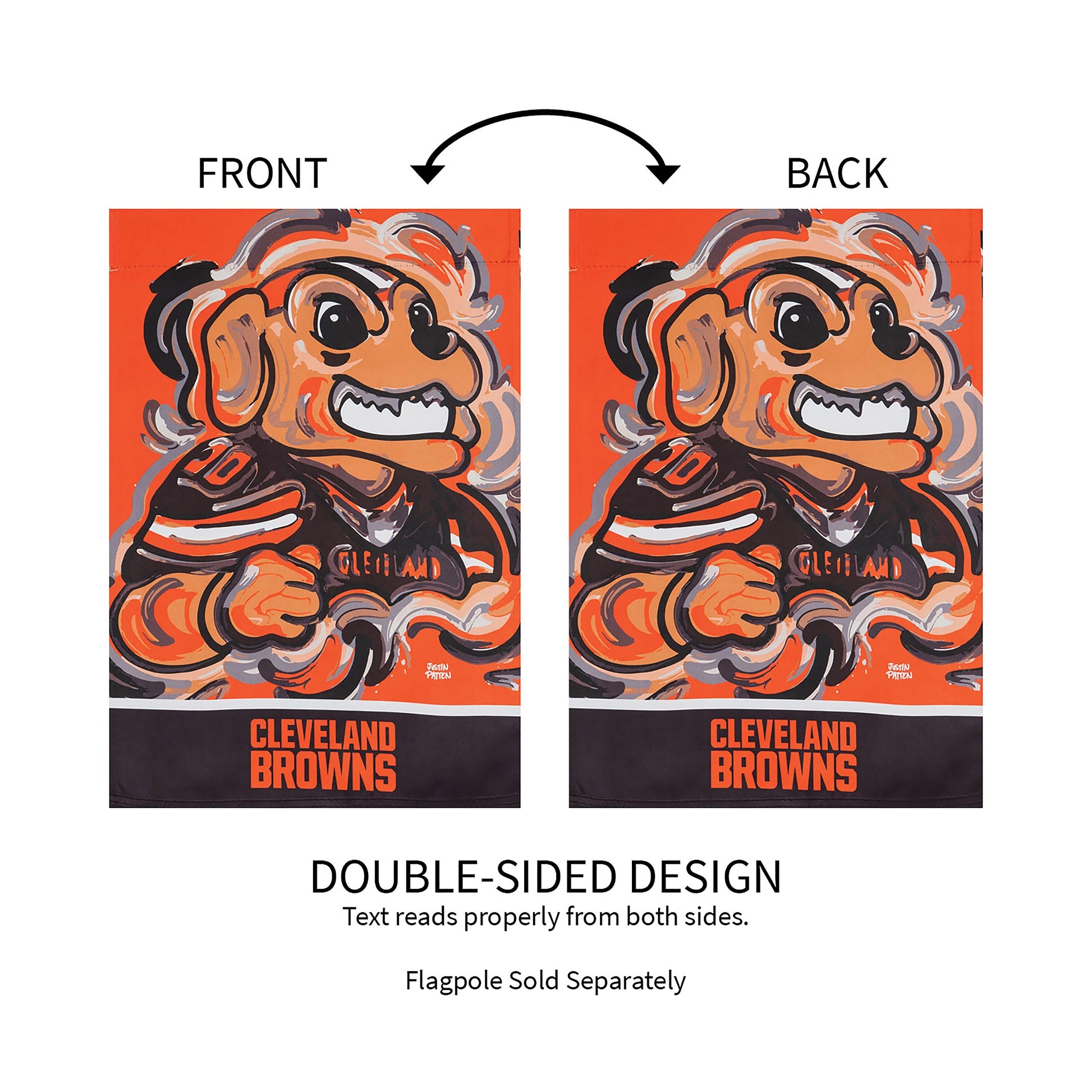 This Cleveland Browns suede garden size flag showcases an original work of art by painter Justin Patten, featuring a whimsical take on the mascot trend for a more artisan look that everyone will love to show support for their team. This house flag is the perfect way to show team spirit during football season and beyond. This Patton piece is truly one-of-a-kind and makes a great gift for a fan. This Suede Reflections flag has artwork that is heat transferred onto sun-blocking material so that it is easily viewed from both sides. The weather-proof material will not fade or fray with continued outdoor use.