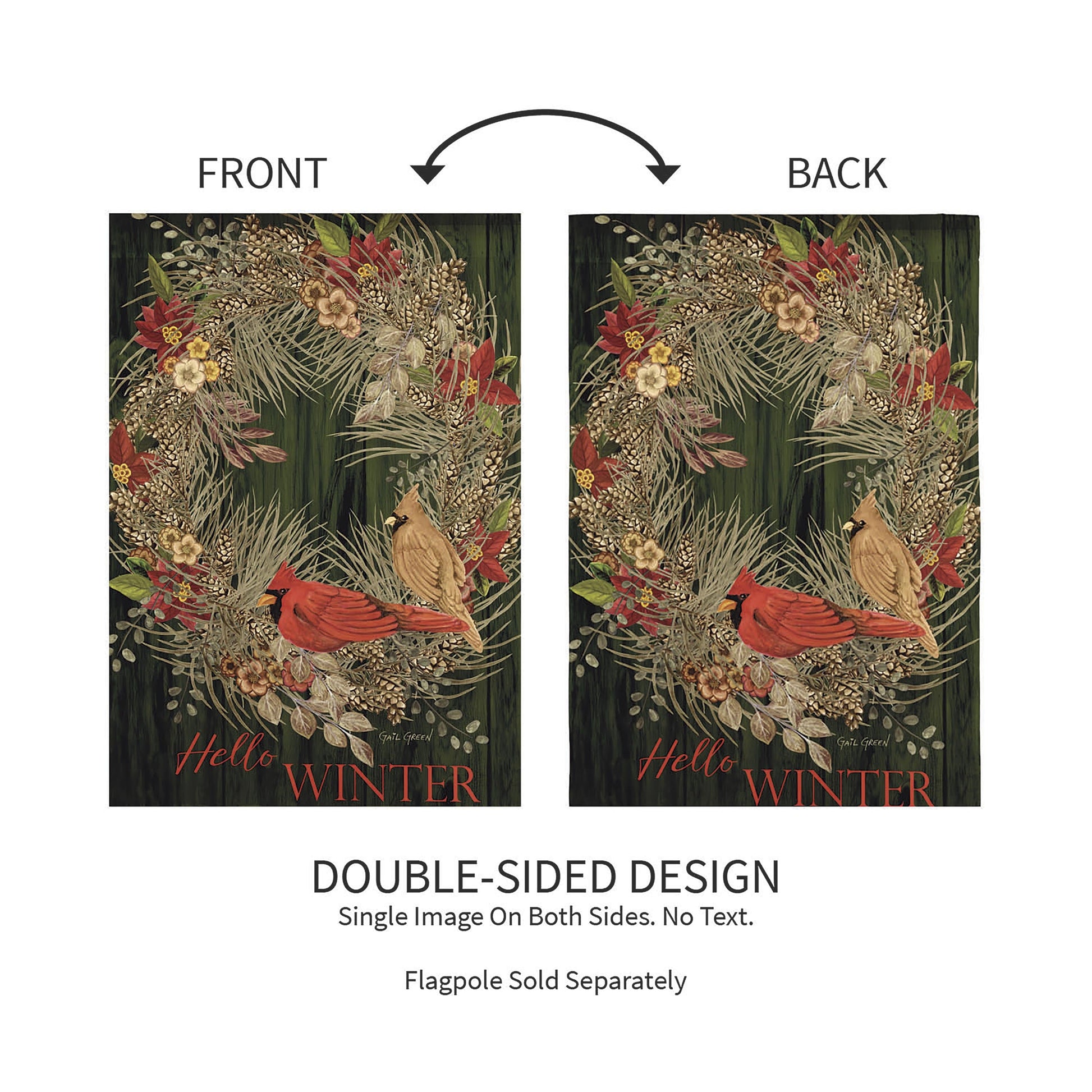 Decorate for the season and welcome friends and family to the home with this moire garden flag. It features a beautiful wreath with flowers and leaves. Two cardinals are sitting on it, and it has a “Hello Winter” message. Evergreen’s Moire flags deliver unmatched shimmer with a beautiful woodgrain effect that enhances each seasonal design. Artwork is heat-transferred onto both sides of the taffeta-like fabric with UV-protected dyes to guarantee vibrancy and durability through all seasons.