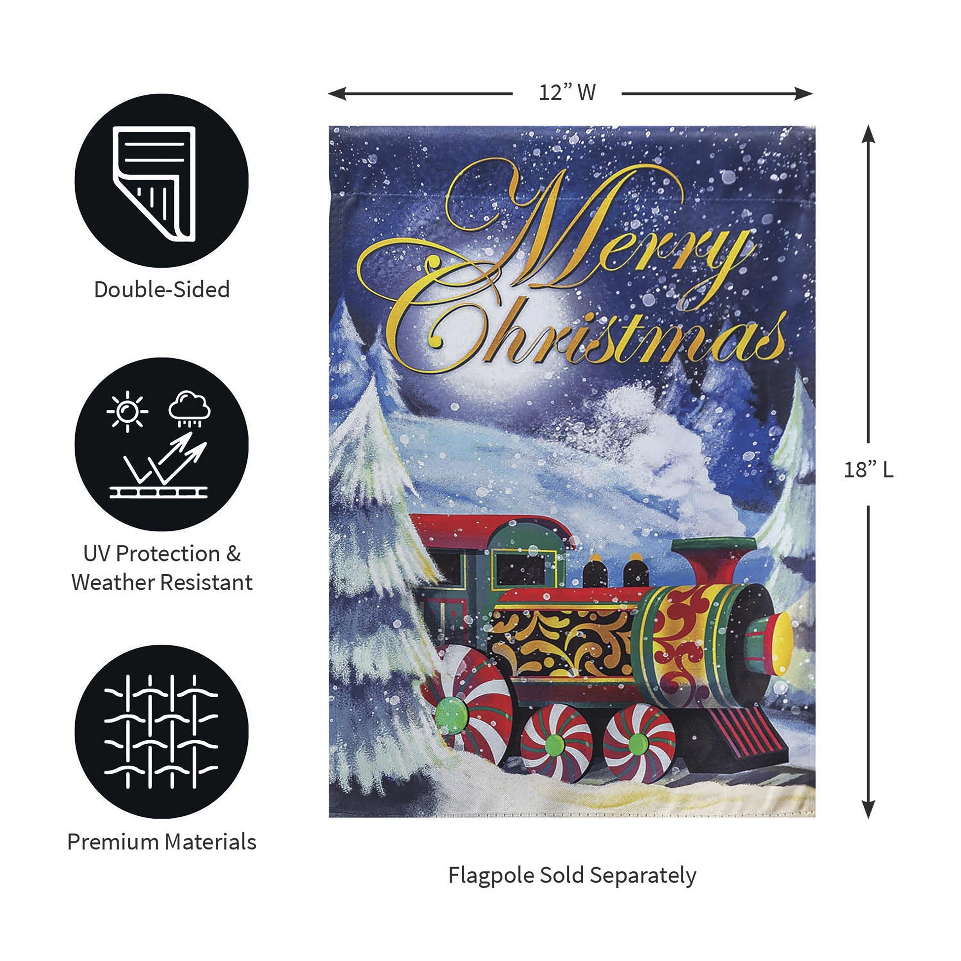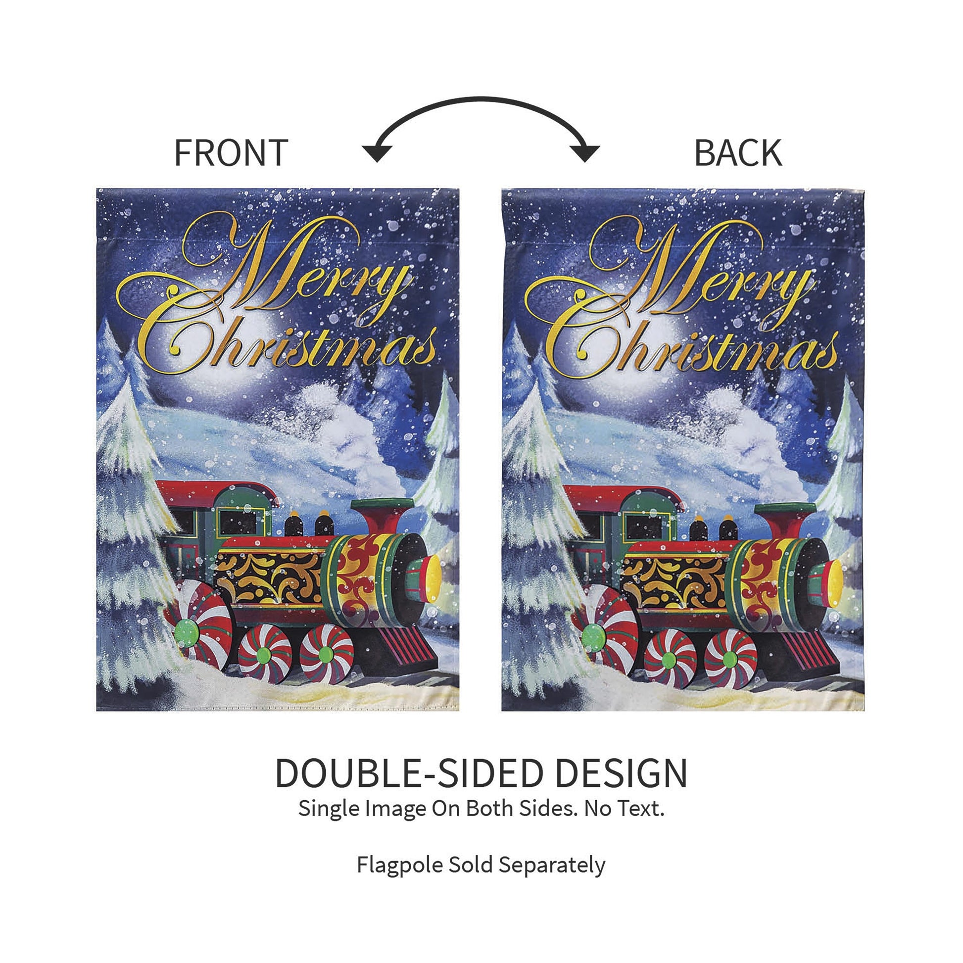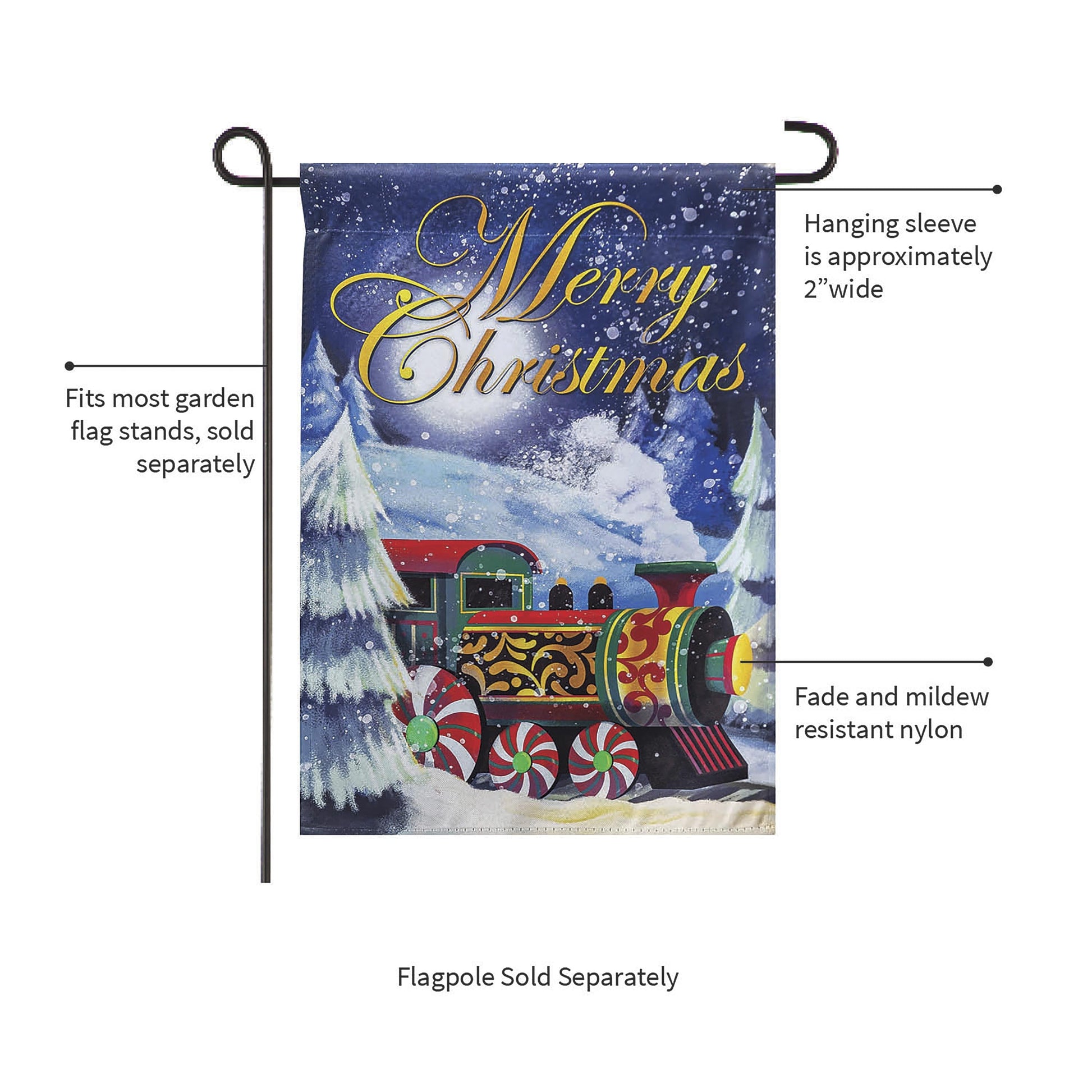 Decorate for the season and welcome friends and family to the home with this suede garden flag. It features a magnificent train with peppermint wheels and golden accents. This snowy scene greets family and friends with subtle elegance. Artwork is heat transferred onto the sun-blocking material so that it is easily viewed from both sides. The weatherproof poly-suede will not fray or fade with continued outdoor use. This flag features a sleeve for use with any standard flagpole or stand, sold separately.