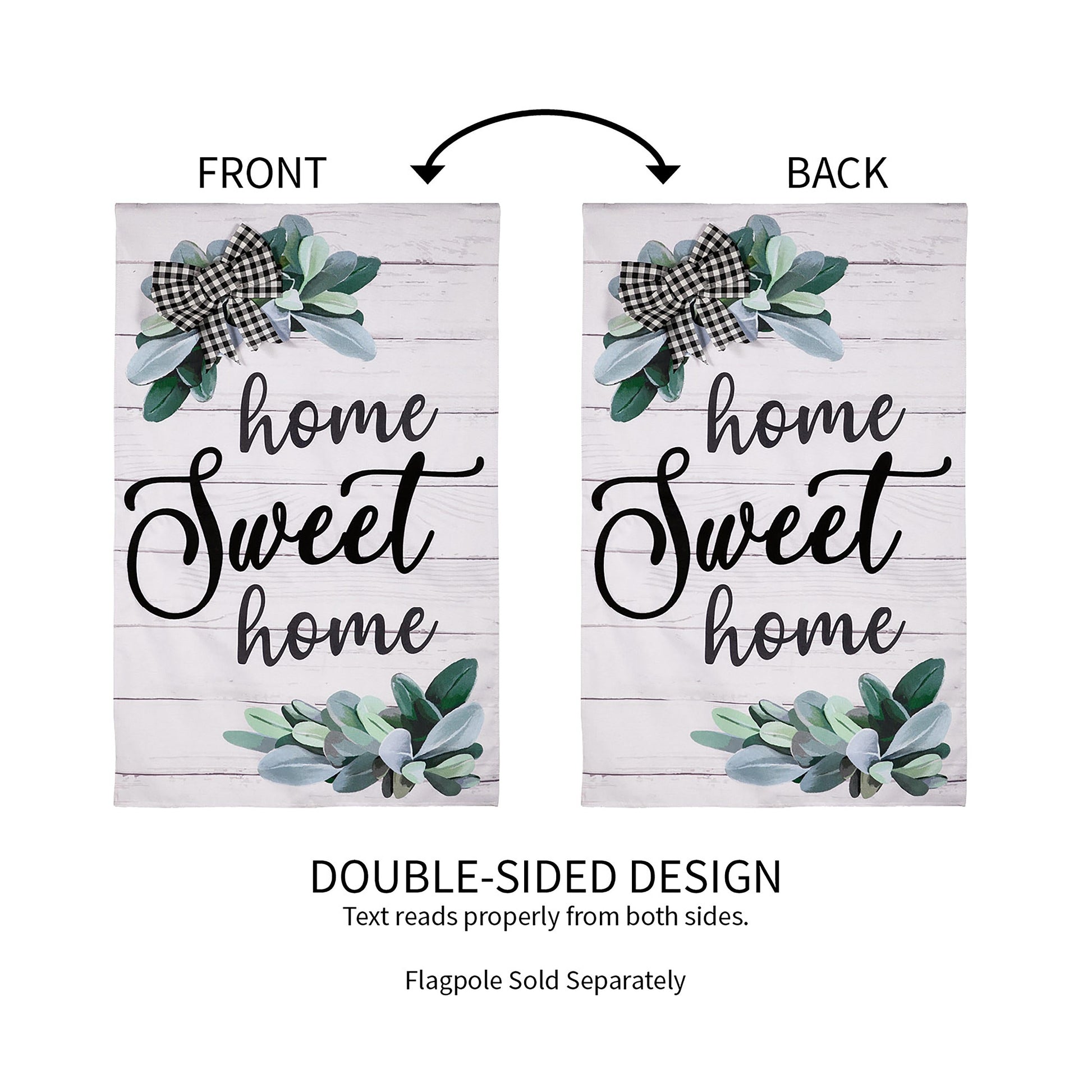Add a touch of class to your home with this Home Sweet Home Eucalyptus House Burlap Flag. Against a wood plank background, two clusters of eucalyptus leaves surround a "Home Sweet Home" message in an elegant script. The top eucalyptus cluster features a buffalo check ribbon embellishment for three-dimensional appeal. This flag is made of medium-weight, soft polyester burlap fabric that has the look and feel of real burlap. Artwork is heat transferred onto both sides of the textured fabric to create a natural, crafted look. The poly-burlap is a durable and weatherproof material that will not fade or fray after continued display. This flag features a sleeve for use with any standard flagpole or stand, sold separately.