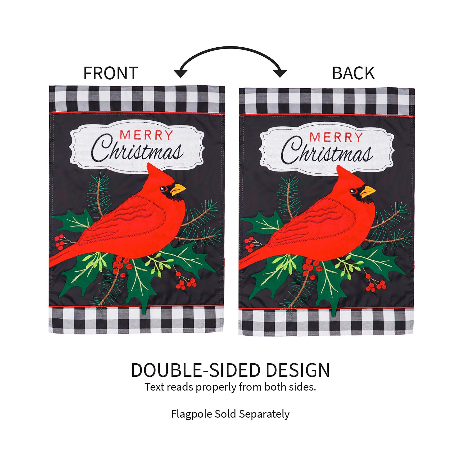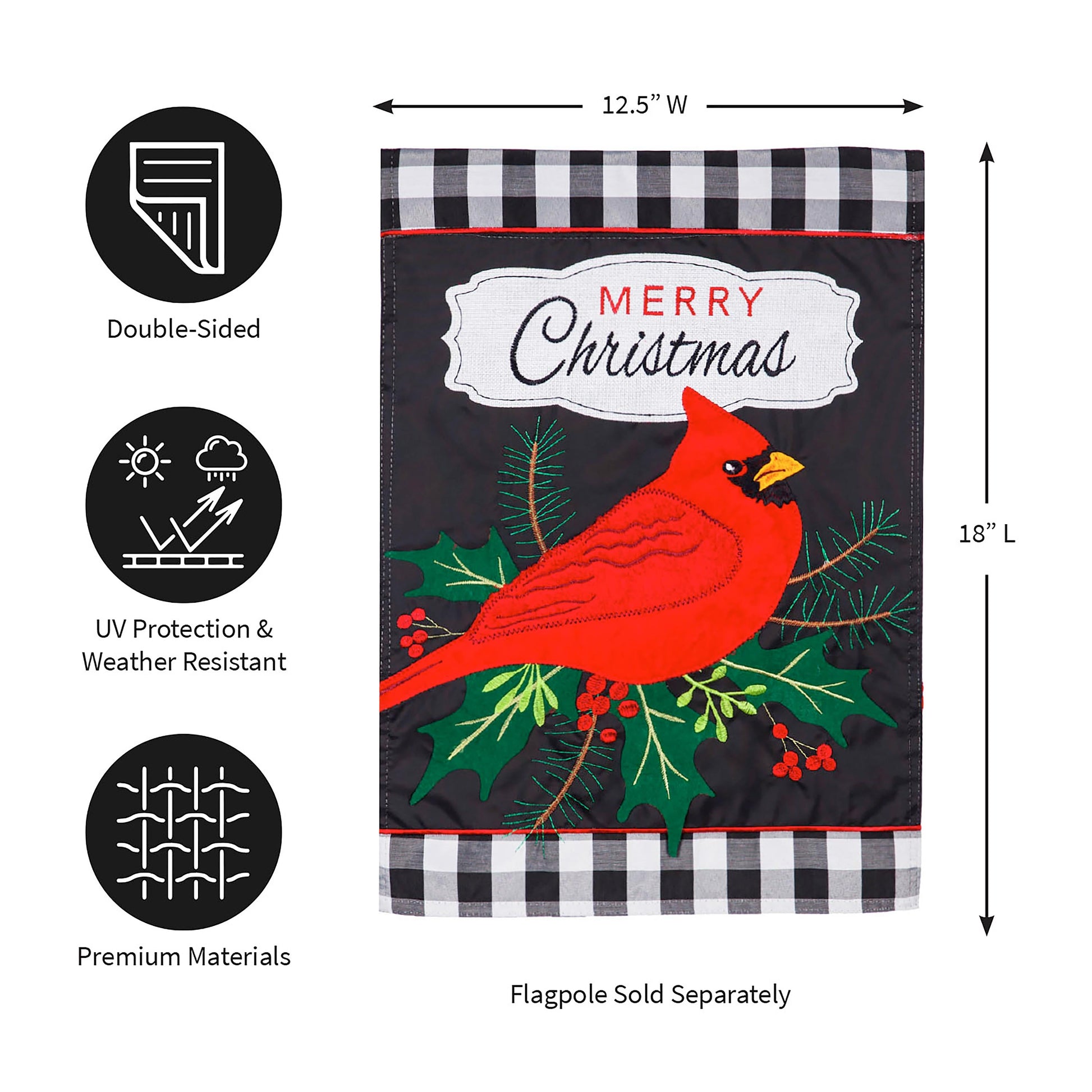 Make a cheery holiday statement with this Merry Christmas Cardinal Garden Applique Flag. The design features white and black checkered borders with a vibrant cardinal stealing the show. Winter foliage and a "Merry Christmas" message make this garden flag perfect for Christmas decor. Each applique flag is made of durable 310 denier nylon to ensure the design will withstand all types of weather. The applique process combines pieces of fade resistant fabric with tight, detailed stitching to create a mosaic effect. The soft, yet heavy-weight material illuminates in the sunlight, making any of our applique flags a wonderful addition to your home or garden. All flags also feature an insertion sleeve at top for use with any standard flagpole or stand, sold separately.