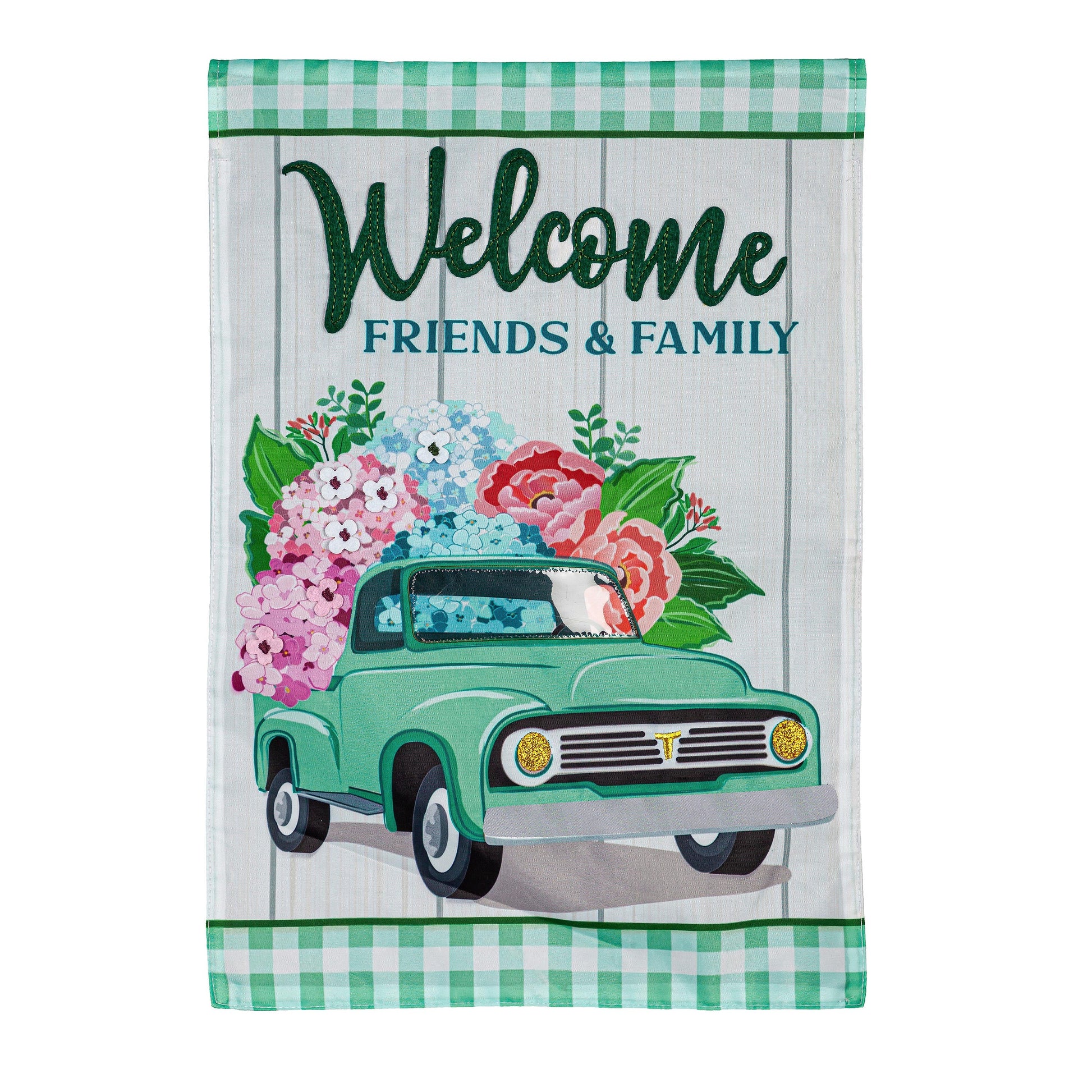 Special Delivery! This vintage pick-up truck is overflowing with blooming flowers on this colorful Spring Flower Delivery House Applique Flag. The dimensional details bring the design to life and the "Welcome Friends and Family" sentiment greets guests in style. Each Evergreen Flag applique flag is carefully crafted from multiple layers of 310 denier nylon that can withstand a variety of weather conditions. We combine pieces of fade-resistant, strong fabric with tight, detailed stitching to create a dimensional mosaic effect. The soft yet heavyweight material illuminates beautifully in sunlight. Each flag features a sleeve that fits standard flagpoles or stands, sold separately.