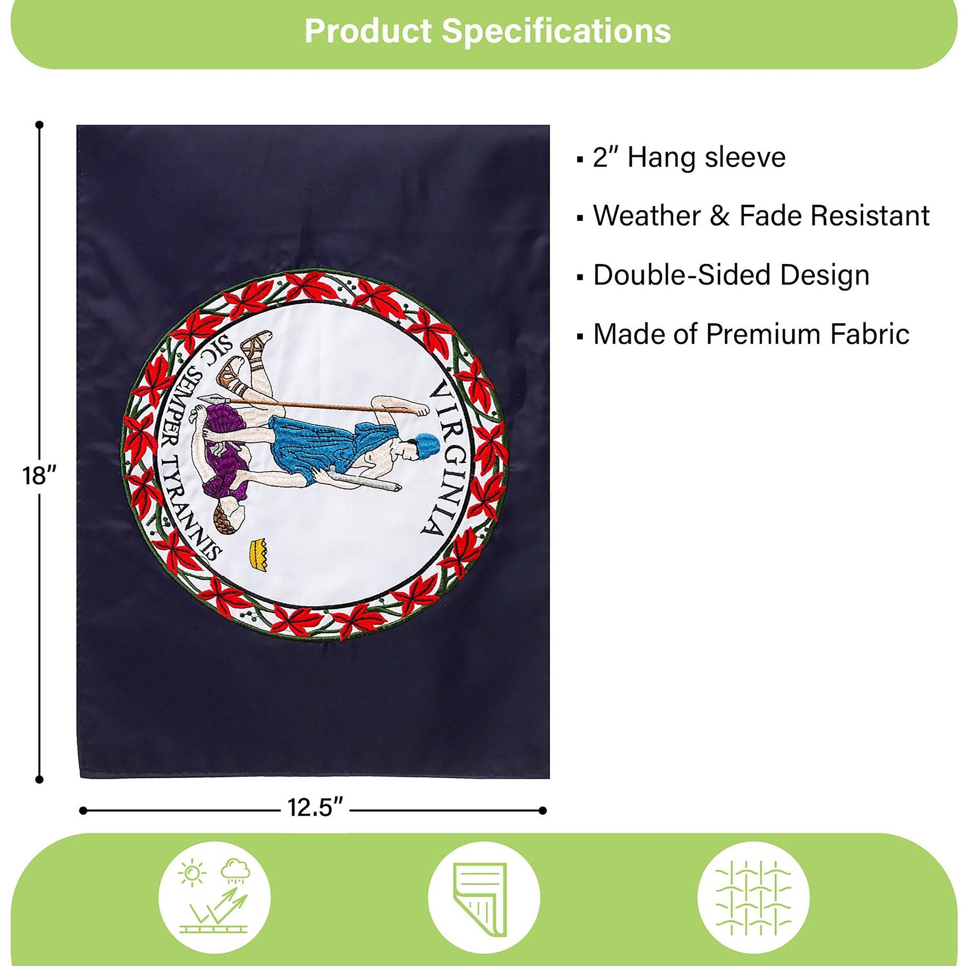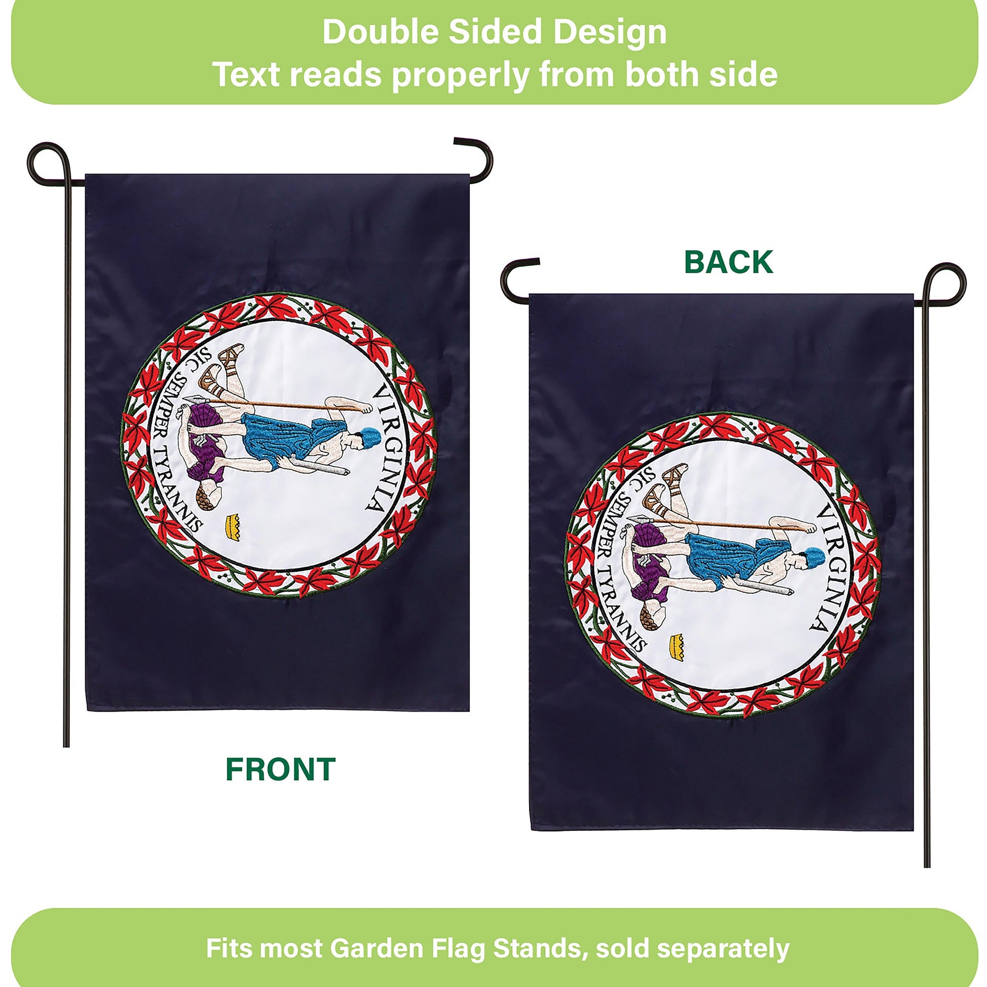 Upon a deep blue background, the Virginia seal is presented on this flag with Lady Virtue standing tall over a fallen tyrant. His displaced crown lies by the side, and bravery and independence are on display. The pride of being a Virginian will be shown off on this flag with every wave in the breeze. This applique flag is made of weather-resistant, 310 denier nylon to ensure the design will withstand all seasons. The applique process combines pieces of high-quality fabric with tight, detailed stitching to create a mosaic effect. The soft, yet heavy-weight material illuminates in the sunlight, making any of our applique flags a wonderful addition to your home or garden. All flags also feature an insertion sleeve at top for use with any standard flagpole or stand, sold separately.