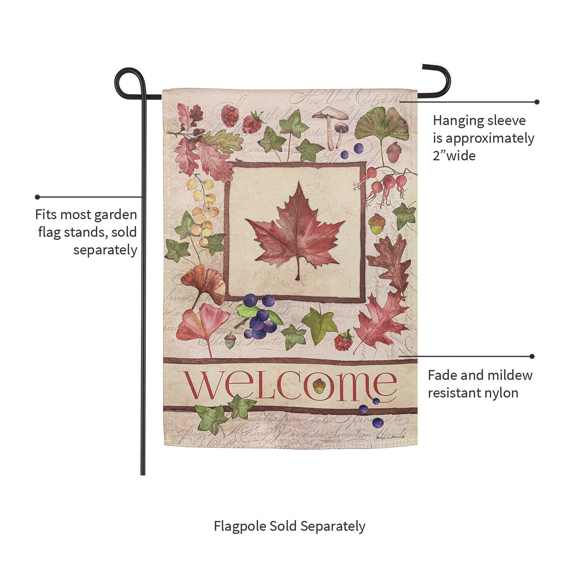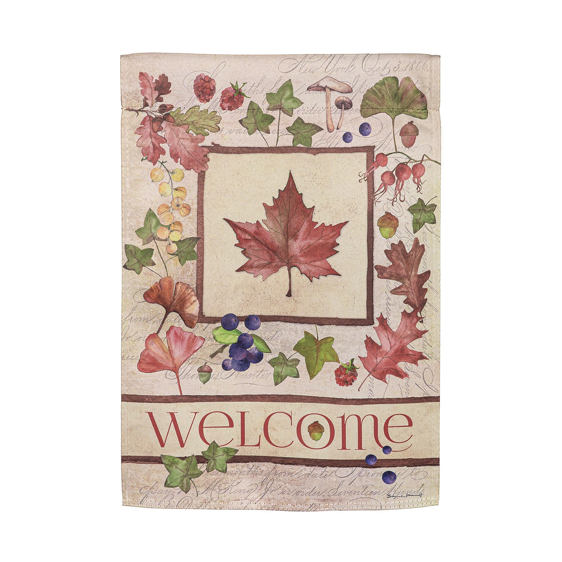 Welcome friends and family to the home with this suede garden flag. It features a Welcome message surrounded by fall leaves. It has an autumn color palette of reds, greens, and yellows. The eye-catching artwork is carefully heat transferred onto sun-blocking material, resulting in beautiful, high-quality finished product. Each Suede Reflection flag is made of weatherproof material that is soft yet durable. Our attention to detail and level craftsmanship ensure that the flag wont fade or fray, even with continued outdoor use.